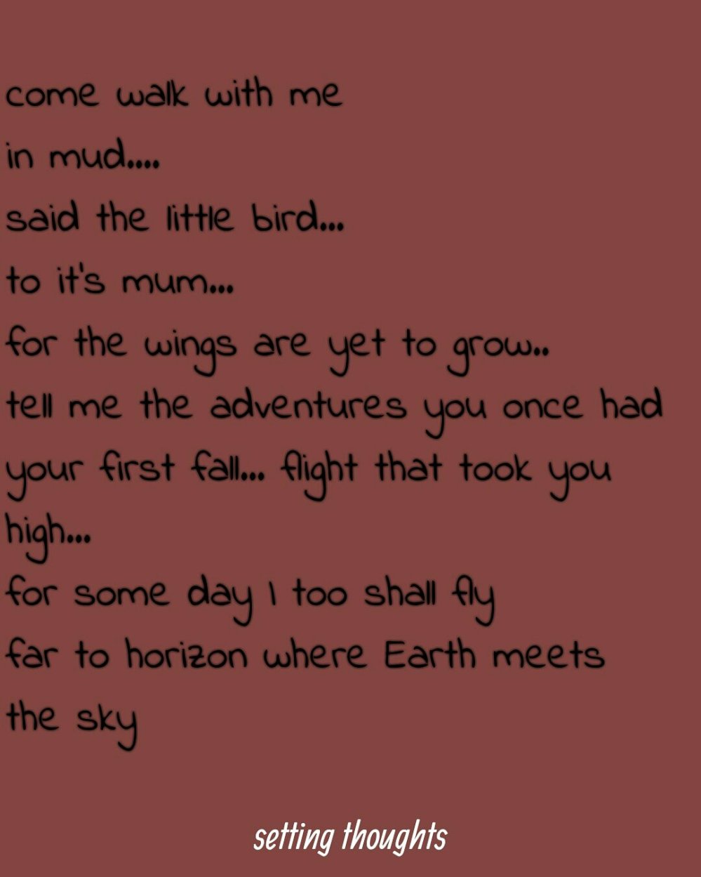 Flash fiction Mud and me Posted by settingthoughts on May 21, 2019 Share this:Tweet Share on WhatsApp (Opens in new window) WhatsApp MoreLike Loading... Related